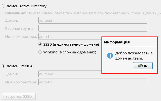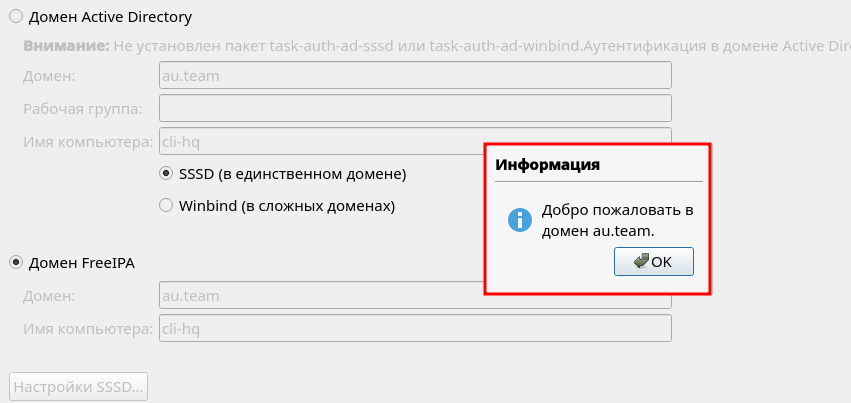 - Для возможности ввода в домен в Центр управления системой должен быть установлен пакет
