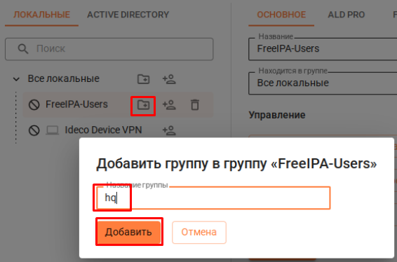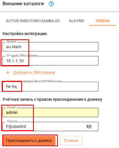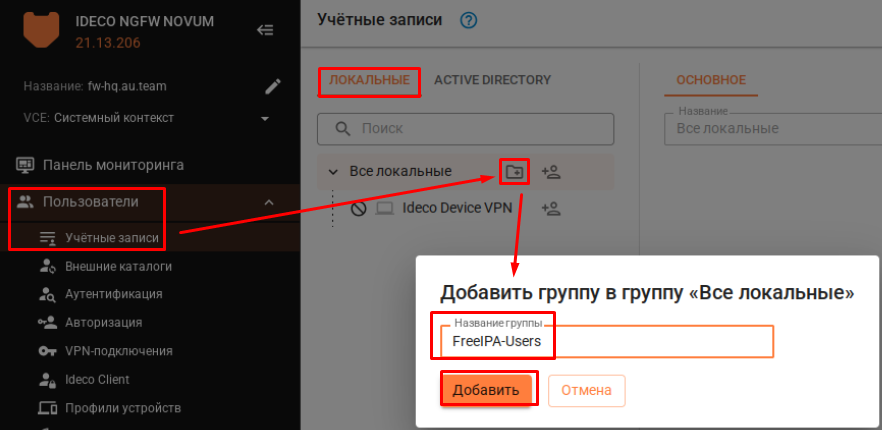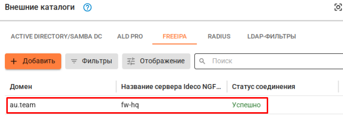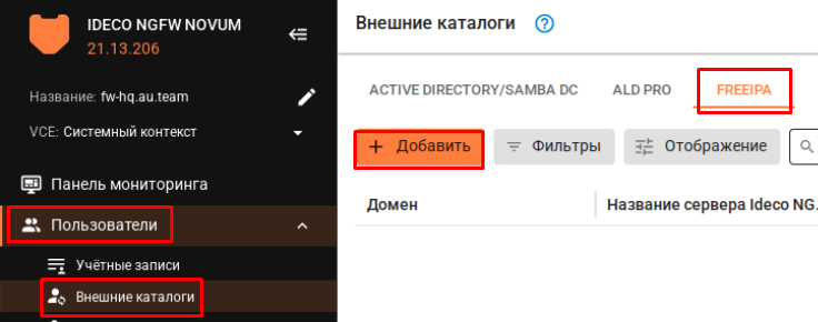 - Для ввода FW-HQ в домен перейдём в Пользователи → Внешние каталоги → FreeIPA и нажмём на кнопку Добавить