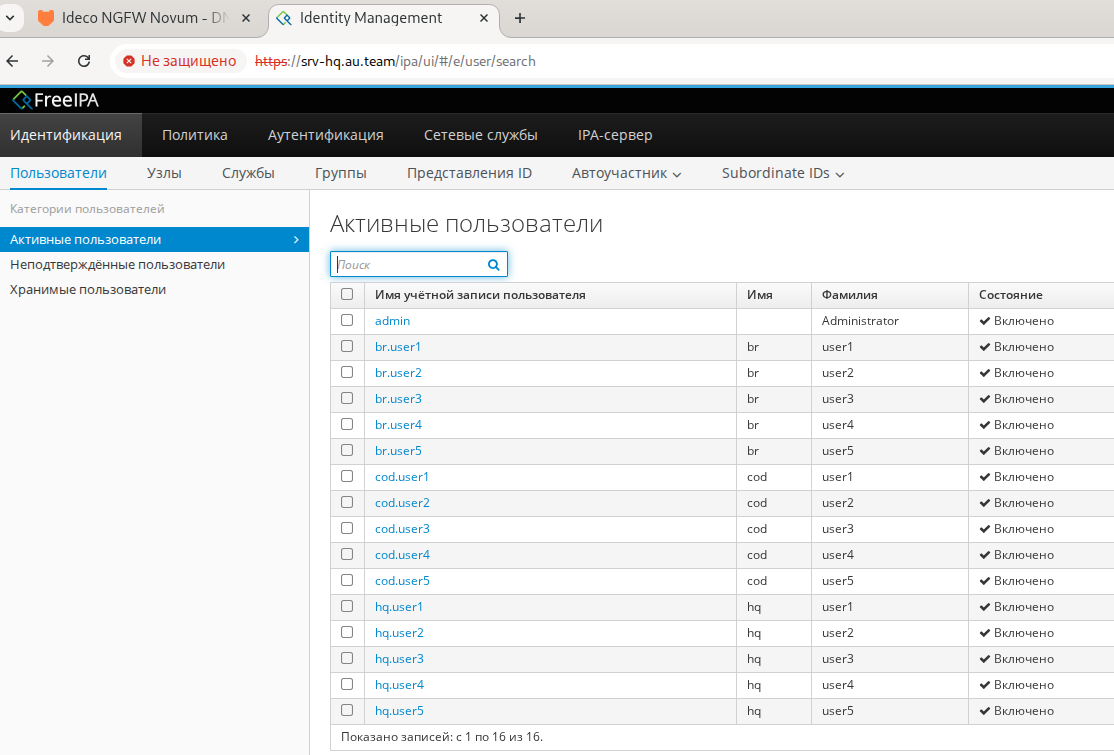 - Переходим в веб-интерфейс Identity Manager в браузере на https://srv-hq.au.team и авторизуемся с учетными данными администратора