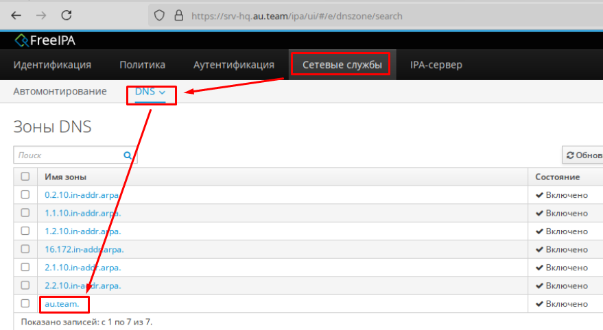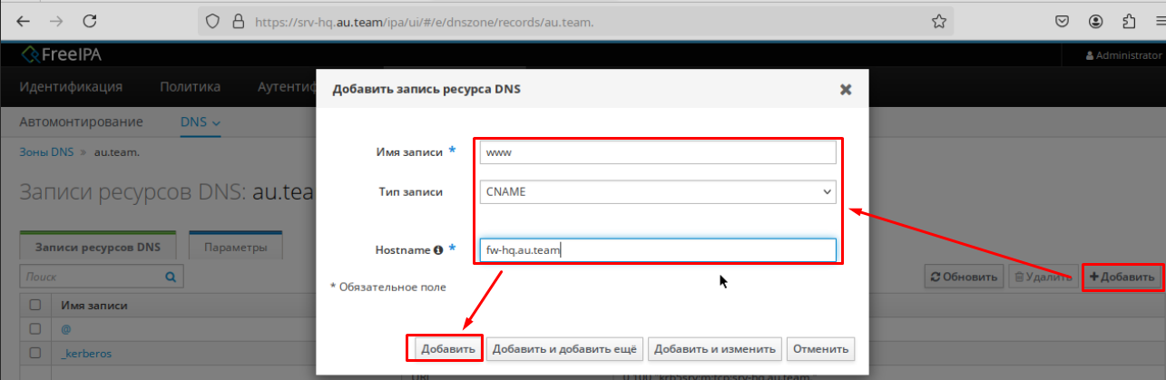 - На DNS во FreeIPA добавляем CNAME запись следующего вида (CNAME www — fw-hq.au.team.):