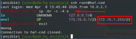 - Создадим необходимые переменные (ens1 — интерфейс HA1-COD):