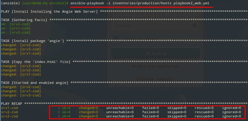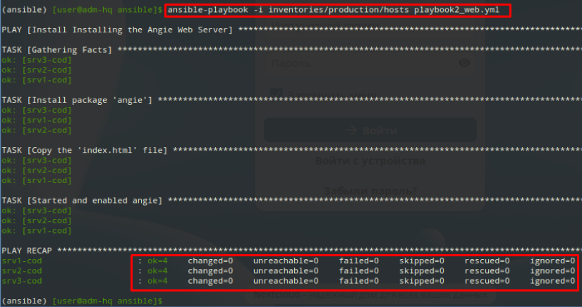 - Запускаем данный playbook повторно, все задачи должны быть OK
