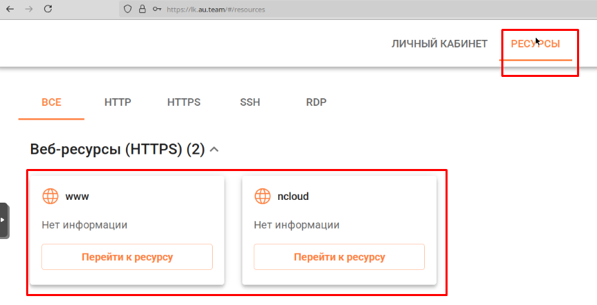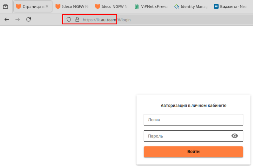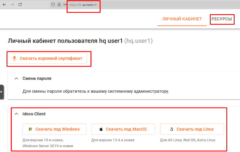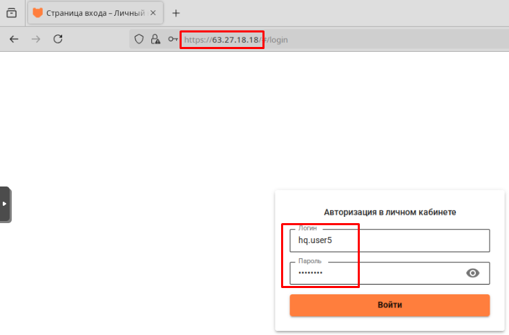 • Проверяем доступ к ЛК из внешней сети (hq.user5@au.team):