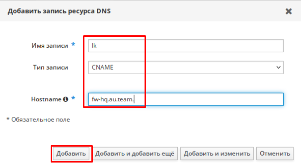 • Переходим в настройку freeIPA https://srv-hq.au.team. Сетевые службы — DNS — зоны DNS — au.team. Создадим CNAME-запись для публикации личного кабинета в локальной сети (в конце точка!!!):