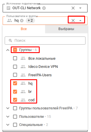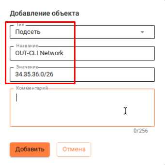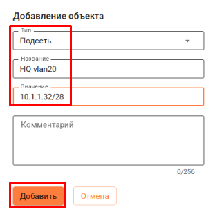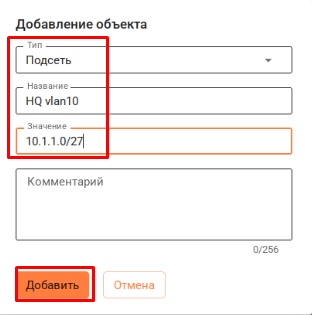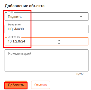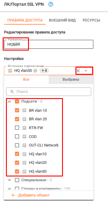 Изменим название и добавим источники (если не все подсети, то добавим объект — подсеть):
