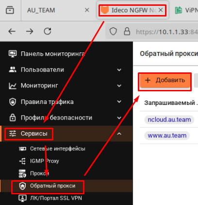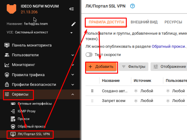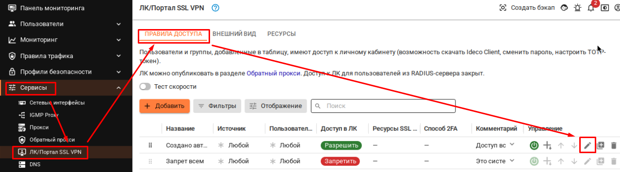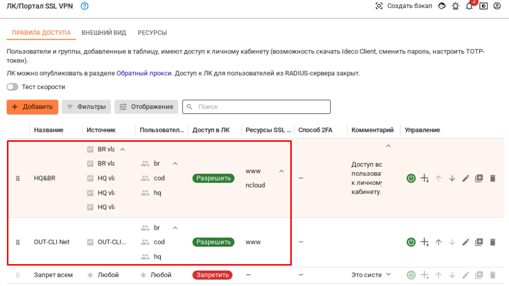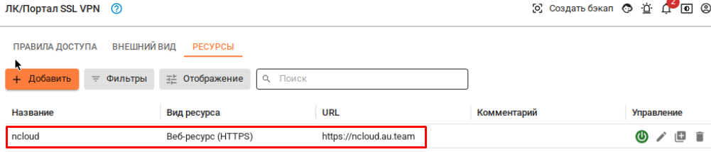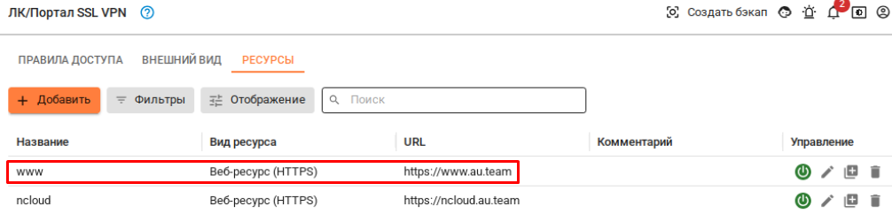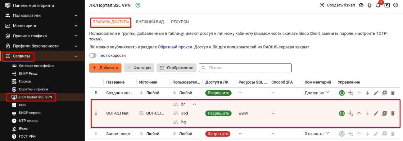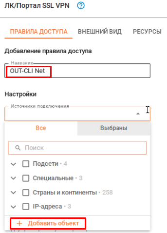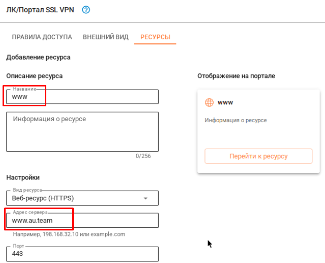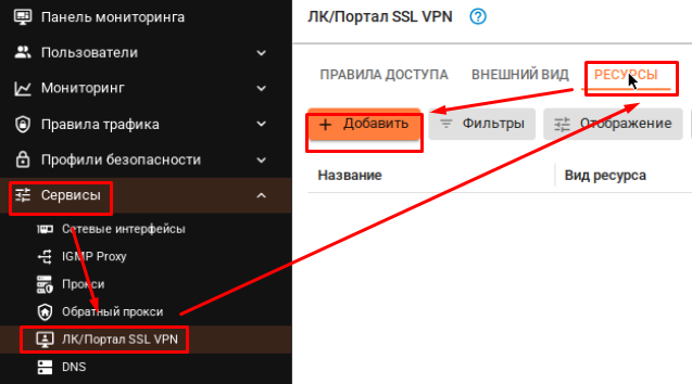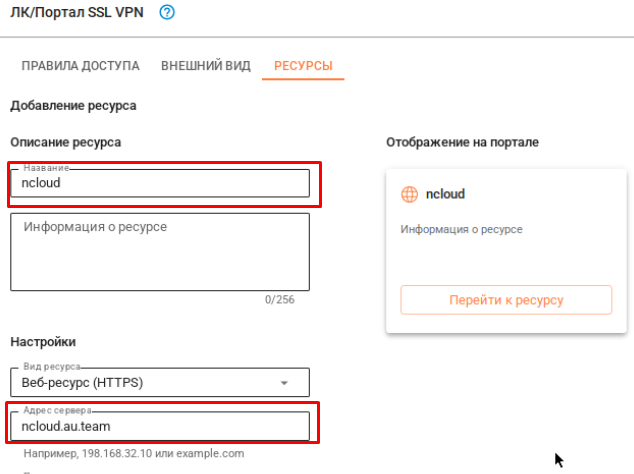 • Настроим ЛК, для работы с ресурсами SSL VPN: