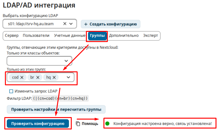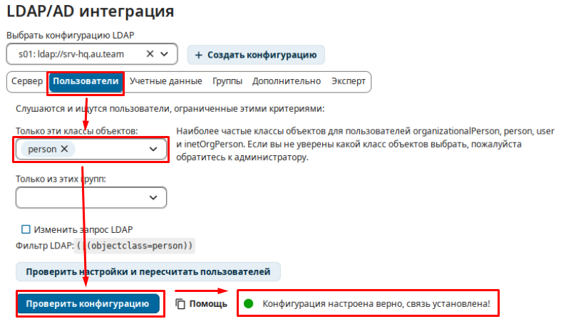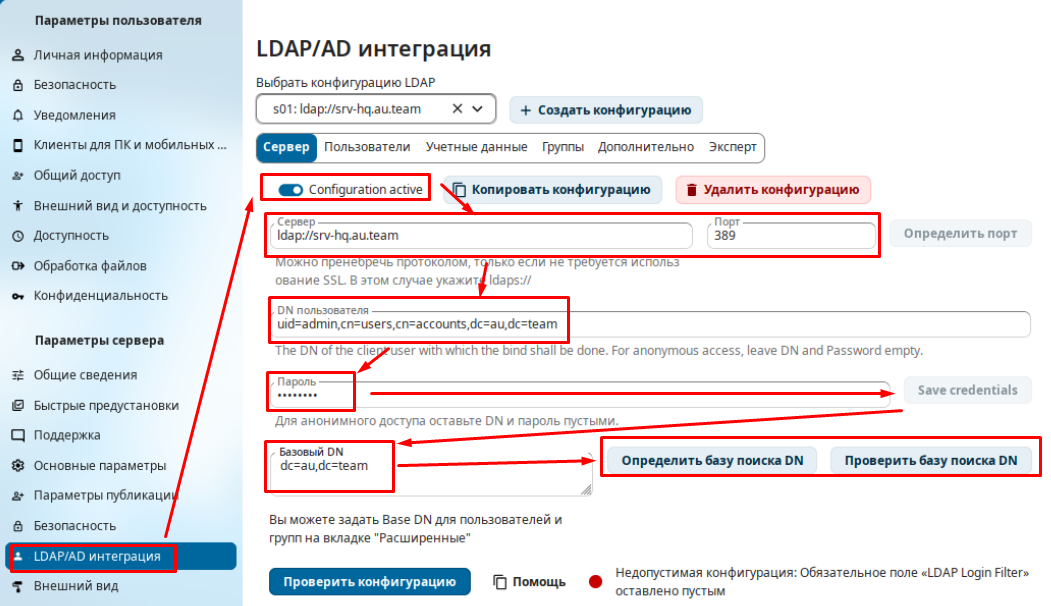- Сама настройка LDAP/AD интеграция может выглядеть следующим образом: