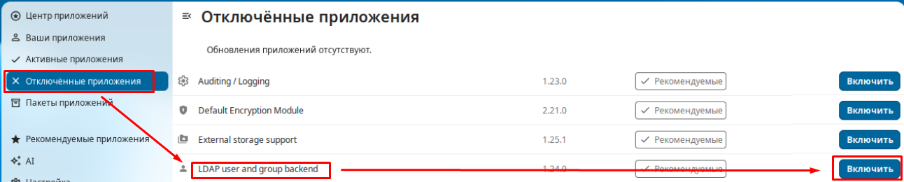 - Для настройки интеграции базы пользователей с LDAP необходимо в списке приложений Nextcloud включить приложение «LDAP user and group backend»: