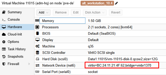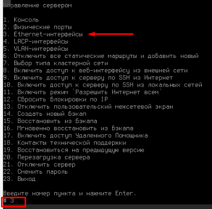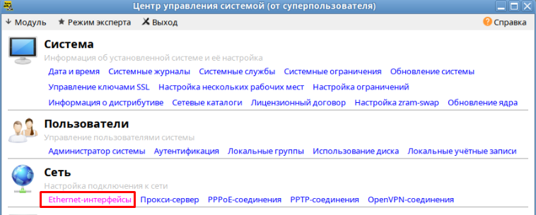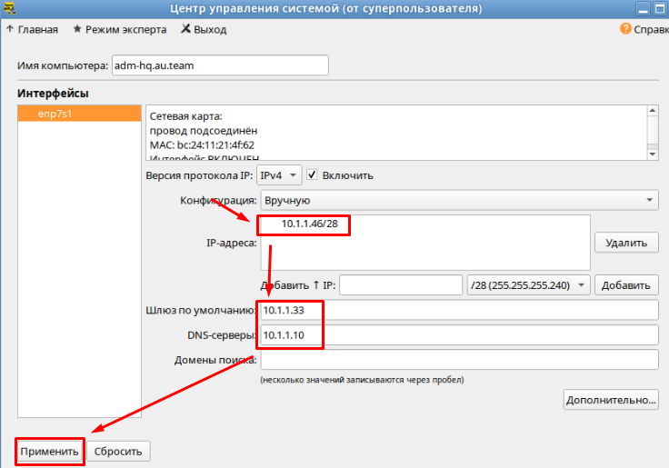 - Перенастраиваем IP-адрес на интерфейсе для ADM-HQ в соответствие с L3. Переходим в Центр управления системой (пароль — toor), далее открываем Сеть — Ethernet-интерфейс. Удаляем старый адрес и добавляем новые данные (10.1.1.46/28, шлюз — 10.1.1.33, DNS — 10.1.1.10)