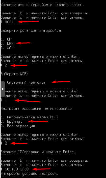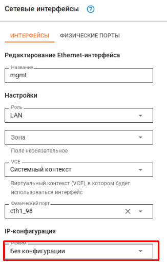 Для первоначальной настройки создадим управляющий интерфейс mgmt с произвольным адресом.